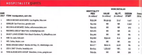 2017年 Hospitality Giants 100全球酒店设计巨头排行榜于近日发布,由美国著名室内设计杂志《Interior Design》发起,一直作为衡量全球大型酒店设计公司的榜单 天堂视频在线,再一次将HBA列为年度酒店设计排名第一的设计公司。