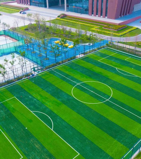 主体建筑南侧为中国梦广场,该运动主题广场,呼应全民健身主题,设有足球场,篮球场,网球场,蓝色塑胶跑道等专项运动场地,满足市民健身的多重需求,场地内部结合运动主题,以彩色地坪 天堂视频,花卉等景观色彩,软化建筑线条感。