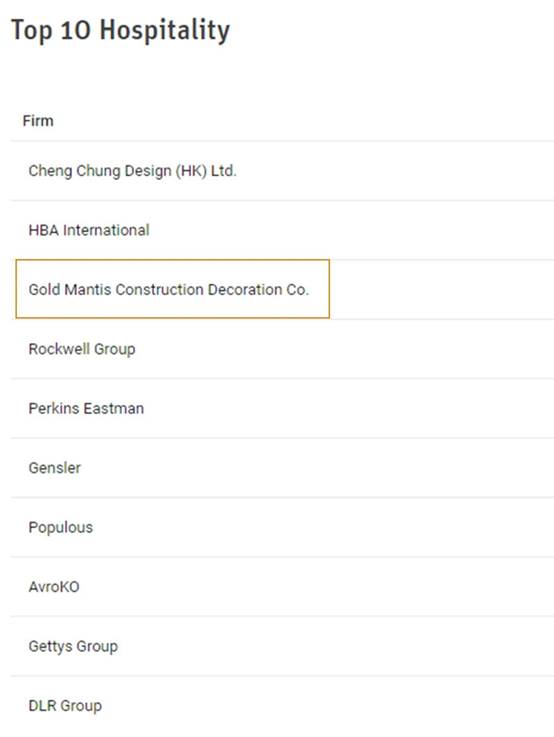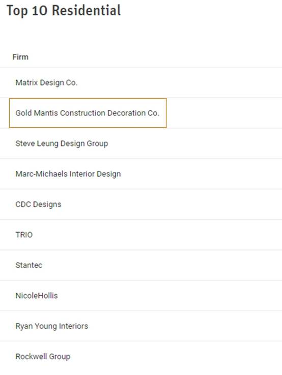 金螳螂荣登全球室内设计商业空间第1名、住宅空间第2名、酒店空间第3名