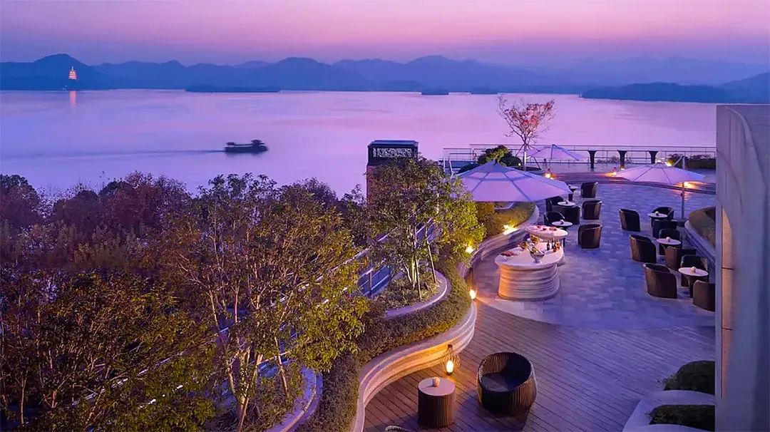 杭州君悦酒店是由杭州凯悦重新装修升级而来,坐落在西湖东岸,圆弧状的酒店设计与西湖的柔情交相呼应。庞大的流线型建筑如同西湖的湖水一般灵动有趣,喷泉随着音乐在西湖畔自在地舞蹈,西湖的微风带来杭州夜色的惬意。