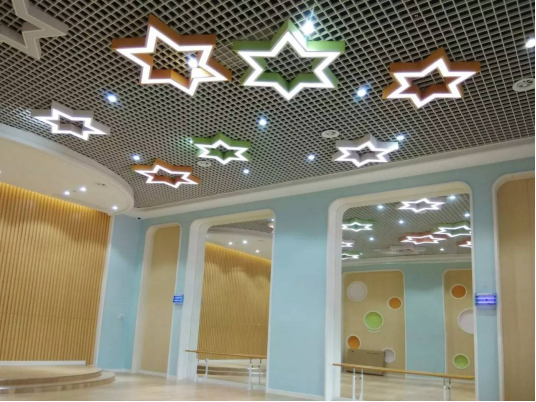 学生形体训练房,挑高数米,镜面的布局装饰,配以色彩斑斓的星型顶灯,呈现出训练房的高端优雅,带来颇有艺术品位的视觉震撼力。