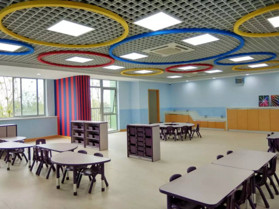苏州科技城外国语学校,在空间和层次上,充满灵动的艺术气息,无论是教室、实验室、活动室、图书馆、餐厅,寝室,都呈现流线型,不同年级配以不同的色调搭配,低年级活泼可爱,高年级沉稳向上,别具一格的的灯具与灯光相互映衬,处处显现美丽与温馨。
