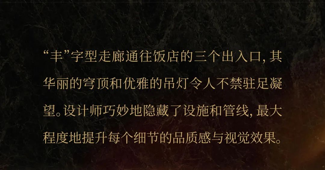 The "Chinese character Feng-shaped" corridor leads to the three entrances/exits of the hotel, and its stunning dome and elegant chandeliers command your attention 天堂影院. The designers ingeniously concealed the facilities and pipelines to maximize the quality and visual effect of every little detail.