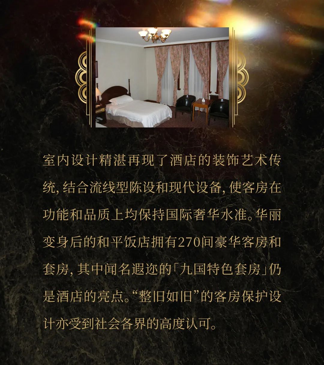 The interior design is a superb reproduction of the hotel's Art Deco heritage, combined with streamlined furnishings and modern fittings to keep the accommodation functionally and qualitatively at the top level of luxury worldwide. The newly transformed Peace Hotel has 270 luxurious guest rooms and suites, of which the renowned "Nine Nations Suite" remains the highlight. The conservation design of guest rooms based on the concept of "renovating the old as old" has been highly recognized by the community 在线影视.