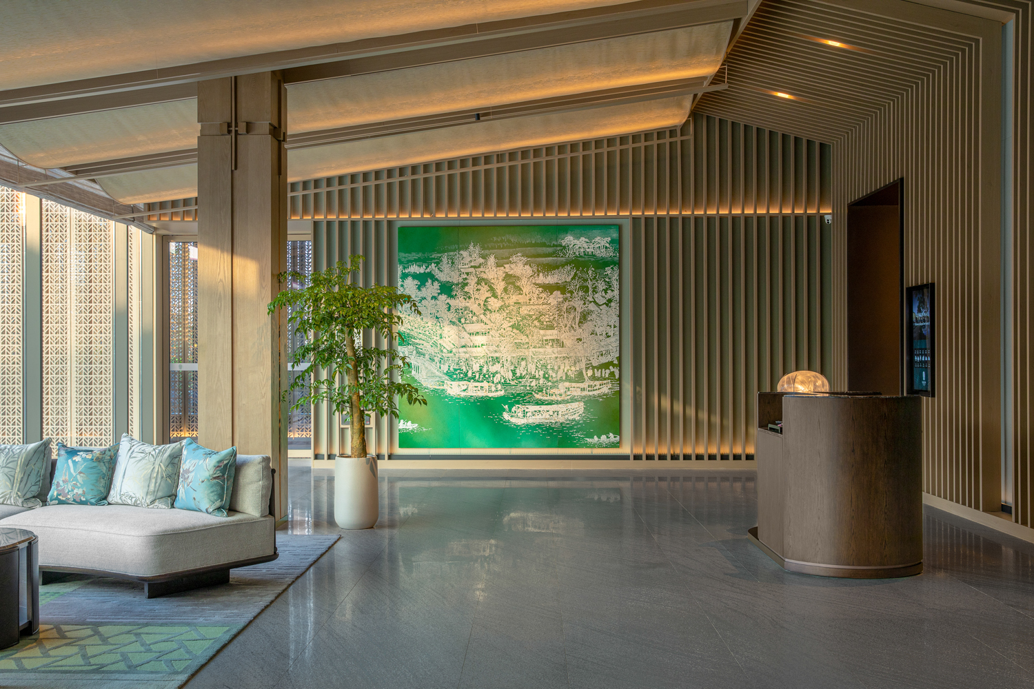 在苏州,在狮山大隐于市的绿色里,悦榕集团旗下悦榕庄和悦椿酒店以复合体形式座落于此,奉献独属于苏州的开场白,悦榕庄的整体风格更加优雅端庄,老钱风十足,年轻化的悦椿酒店更活泼明艳,主打家庭亲子出游,酒店建筑由GOA大象设计,室内设计则是金螳螂旗下HBA打造 天堂视频在线,金螳螂承接了两座酒店所有客房,包括大堂吧,餐厅,会议空间,泳池等公区室内精装修部分,总装饰面积29288㎡,在粉墙黛瓦这块“画布”上,移步易景,一砖一瓦打造出独具姑苏意蕴的避世之所。